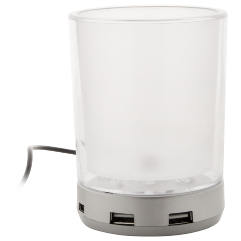 4 USB (2.0) kimeneteles asztali tolltartó, kék fénnyel világít. A tolltartó 2 fala közé egyedi nyomtatott grafika helyezhető. Anyaga: ABS.