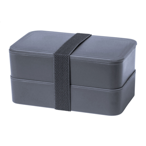 PP műanyag uzsonnás doboz evőeszköz készlettel (villa, kanál és kés) és rugalmas pánttal. 2 rekeszes, egyenként 700 ml űrtartalmú rekesszel.
