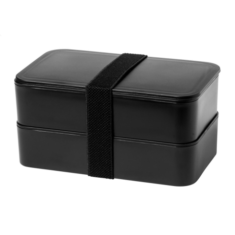 PP műanyag uzsonnás doboz evőeszköz készlettel (villa, kanál és kés) és rugalmas pánttal. 2 rekeszes, egyenként 700 ml űrtartalmú rekesszel.