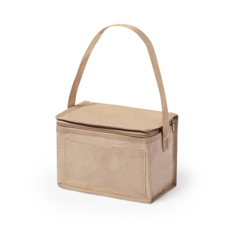 Cipzáras laminált újrahasznosított papír hűtőtáska alumínium béléssel, 6 db 0,33 l-es italdoboz részére. Elülső zsebbel, mely ideális emblémázáshoz.