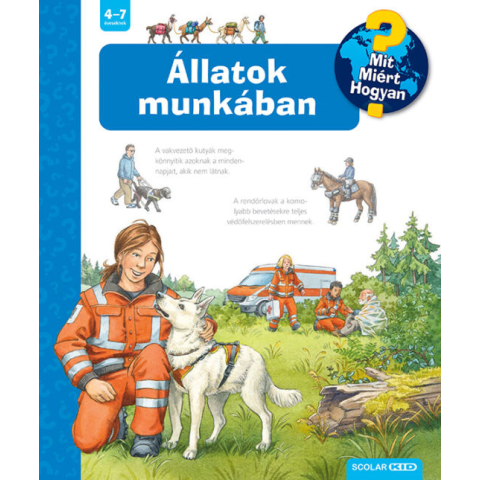 A népszerű Mit? Miért? Hogyan? gyermekkönyvsorozatának 58. kötetét lapozgatva az óvodások és a kisiskolások megtudhatják, milyen állatok lehetnek a segítőtársaink és hogyan tudnak nekünk segíteni, mit csinálnak a kutyák a rendőrségen, ki segít a vízi baleseteknél, hogyan gyakorolnak a segítőállatok.