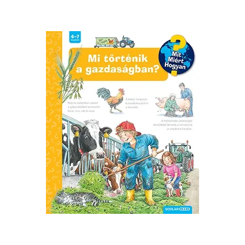 A Ravensburger népszerű Mit? Miért? Hogyan? gyermekkönyvsorozatának 66. kötetét lapozgatva az óvodások és a kisiskolások megtudhatják, hogyan néz ki belülről a tehénistálló, honnan kapjuk a tejet, milyen gépekkel dolgoznak a földeken, miért tartanak a gazdák kecskét és birkát, hol teremnek a zöldségek, hol teremnek a gyümölcsök, mi az a biogazdaság, mi fán terem a falusi turizmus.