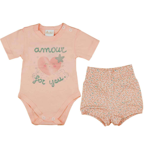 Öltöztesse fel kisbabáját ebben a gyönyörű 2 részes szettben, melyet szívecskés mintával díszítettünk. A rövid ujjú, vállon patentos baba body és a gumis derekú rövidnadrág tökéletes választás a melegebb napokra. A body fehér színű, melynek tiszta, friss