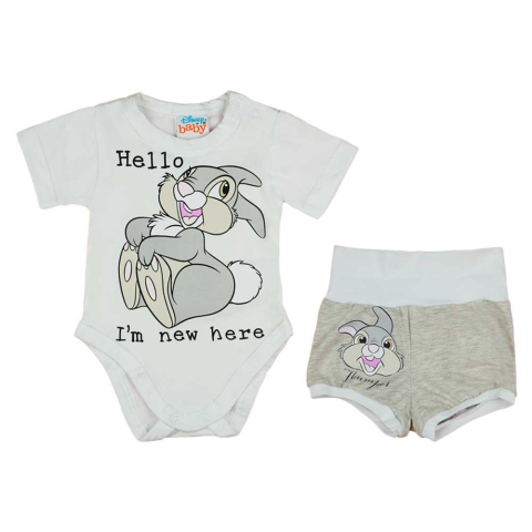 Ebben a 2 részes baba szettben a kicsik igazán díszesek lehetnek! A szett része egy vállon patentos rövid ujjú baba body, amelyen vidám Thumper nyuszi minta látható, valamint egy ugyanilyen mintával ellátott baba rövidnadrág. Mindkét darab a Disney eredet