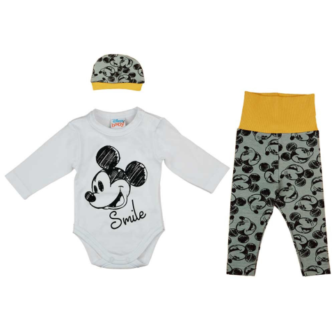 3 részes kisfiú baba szett Mickey egér mintávalEredeti Disney termékNagyon cuki és igazán kispasis ez a 3 részes szett, ami egy hosszú ujjú bodyt, egy baba nadrágot és egy sapit tartalmazz. Bababarát, könnyen kezelhető pamut anyagból készült. A nadrág rug
