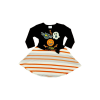 Szívdobogtatóan cuki, Halloween ihlette kislány ruha, amely a tökéletes választás a szellemes ünnepre! A ruha fekete színű, melyet vidám, tündéri szellemek díszítenek. Az alja csíkos, ami tovább fokozza a ruha játékos jellegét. Az elasztikus pamutból kész
