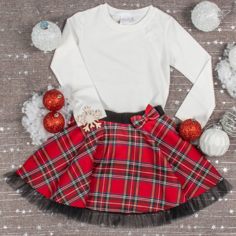 Ragyogjon a kis hercegnő bármely alkalmi eseményen ezzel a csodálatosan elegáns, masnival és tüllel díszített kockás szoknyával! A piros színű, mintás darab igazán különleges és feltűnő viselet lesz a kicsik számára. A szoknya anyaga 65% pamut és 35% poli