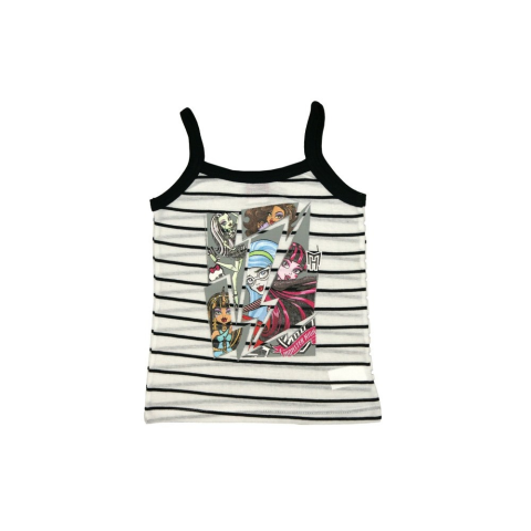 Egy igazán trendi Monster High mintás spagetti pántos top minden kislány álma! A fehér színű, csíkos alapon Monster High mintával nyomott top igazán egyedi és stílusos. Az 100% pamut anyag gondoskodik a tökéletes komfortérzetről, míg az I. osztályú minősé