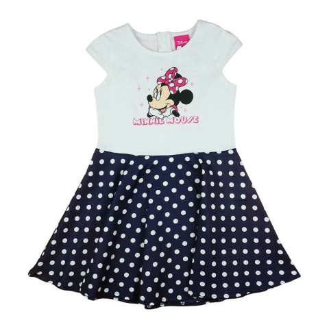 Minden kislány kedvence lesz ez a vidám, pörgős ruha, amelyet a Disney világából ismert, csillogó Minnie egér minta díszít. A sötétkék-fehér pöttyös textilek igazán divatosak és jól mutatnak nyáron. A ruha felső része elasztikus pamutból készült, ami nagy