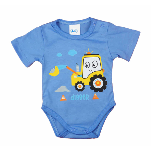 Középkék színben pompázó, rövid ujjú baba body, amelyet egy játékos Markoló minta díszít. Ez a darab nem hiányozhat a kisbabák ruhatárából, hiszen jól kombinálható más darabokkal, legyen az egy kis nadrág, szoknya vagy éppen egy melegítő. 100% pamutból ké