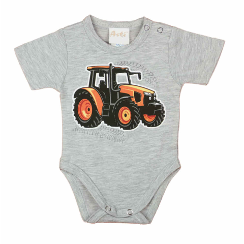 Készüljön fel a mezőgazdasági kalandokra ezzel a rövid ujjú baba bodyval, amelyen vidám traktor minta díszeleg. Szürke színben pompázó, Magyarországon készült darab, amely alapvető eleme lesz gyermeked öltözékének, és könnyedén kombinálható más ruhadarabo