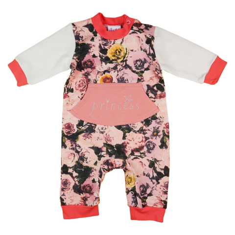 A rózsa mintás hosszú ujjú rugdalózónk igazi hercegnőnek való! A Princess felirat és a glitteres díszítés miatt minden kislány szíve megdobban majd, amikor meglátja. A vállon elhelyezett patentok segítségével könnyedén fel- és leöltöztheti babáját, így a
