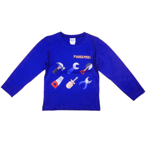 Szerszámos motívummal díszített, hosszú ujjú fiú póló, amely kiváló minőségű magyar gyártmány. A klasszikus szerszámos minta modern dizájnnal van felnyomva a pólóra, így tökéletes választás az aktív fiúk számára. A 100% pamutból készült anyag puha, lélegz