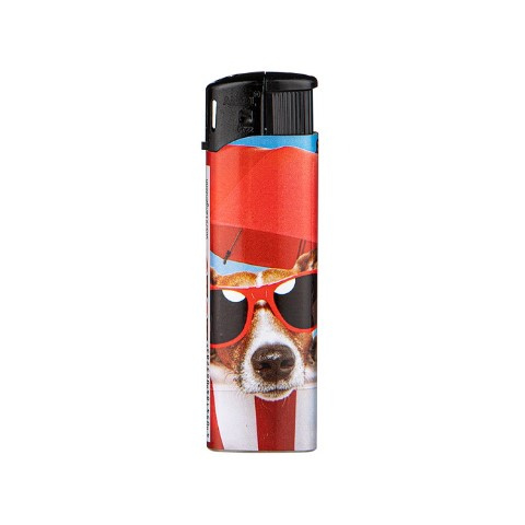 Angel márkájú színes öngyújtó, az elején egy napszemüveges kutyát ábrázoló képpel. A gyújtó újratölthető, a láng állítható és Piezzó gyújtás biztosítja a szikrát. Viszonteladói partnereink részére: 50 darab rendelése esetén a képen látható kínáló tálcával együtt küldjük. Kérjük előtte regisztráljon.