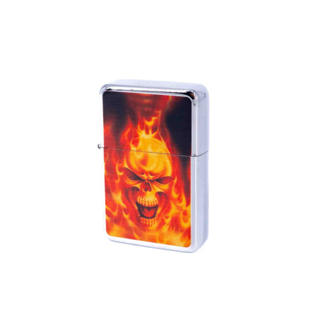 Króm felületű, igazán tüzes, lángoló koponya mintájú benzines öngyújtó. Klasszikus tűzköves vihargyújtó, mely benzinnel tölthető. Az öngyújtó üres állapotban kerül kiszállításra. Amíg nincsen feltöltve addig nem is használható!Méretek: 5,8 x 3,9 x 1,3 cm