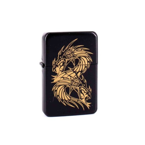 Fekete színű benzines öngyújtó, az elején egy arany színű sárkányt ábrázoló képpel. Klasszikus tűzköves vihargyújtó, mely benzinnel tölthető. Az öngyújtó üres állapotban kerül kiszállításra. Amíg nincsen feltöltve addig nem is használható!Méretek: 5,8 x 3,9 x 1,3 cmTrafikok és viszonteladói partnerek részére lehetőség van kedvezőbb áron egész tálca megvásárlására is. A viszonteladói árakhoz kérjük előtte itt regisztráljon.