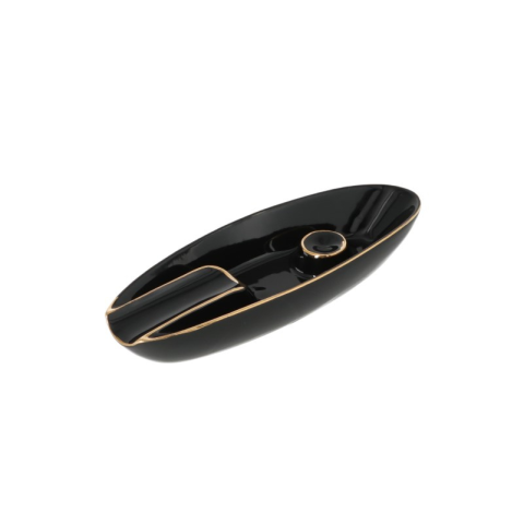 Angelo hosszúkás kerámia szivar hamuzó, 1 szivarnak elegendő hellyel. Igazán elegáns, kellemes megjelenésű, fényes fekete színű, aranyozott peremű, csónak alakú hamutállal és szivar tartóval. A szivarozás közben érdemes szüneteket tartani két pöffentés között, a kerámia bölcső biztosítja, hogy a szivar vízszintesen tudjon piheni, ezzel egy hosszú, egyenletes égést biztosít a szivarnak. A hamuzó oldalán Angelo márkajelzés.Méretek: 17 x