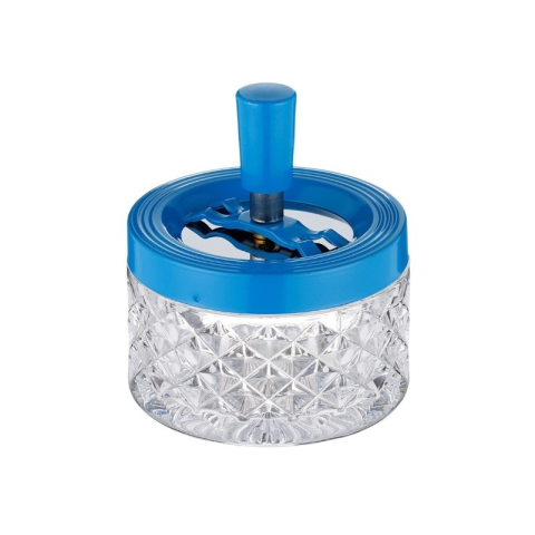 Finom tapintású, rombusz mintázatú, királykék felső résszel, 9 cm átmérőjű üveg hamutartó, melynek magassága 11 cm a pörgetővel együtt. Különleges kialakítású, ami megkönnyíti a hamu és a csikk szagmentes tárolását. Tisztítása egyszerű, csupán le kell tekerni a billenős felső részt és máris könnyen hozzáférhető lesz a hamuzó rész. Dekoratív megjelenése miatt a lakás dísze lehet.Méretek: 9 x 11 cmSúly: 422 gramm