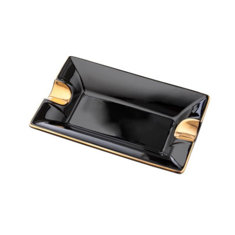 Kiváló minőségű porcelánból készült fekete színű szivar hamutál, 2 szivarnak elegendő hellyel. A szivar hamuzó élei aranyozottak. A hamuzó úgy van kialakítva, hogy a szivar vízszintesen tudjon piheni rajta, ezzel egy hosszú, egyenletes égést biztosítva a szivar számára.Méretek: 18 x 12 x 3 cm