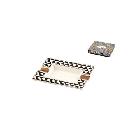 Minőségi porcelánból készült fekete/fehér színű mintás szivar hamutál, 2 szivar számára. A szivar hamuzó bölcső része ahova a szivart helyezzük arany színű. A hamuzó szivarosok számára készült, hogy a szivar vízszintesen tudjon piheni rajta, ezzel egy hosszú, egyenletes égést biztosítva a szivar számára. Angelo feliratos díszdobozban szállítjuk.Méretek: 20,3 x 17,1 x 2,7 cm