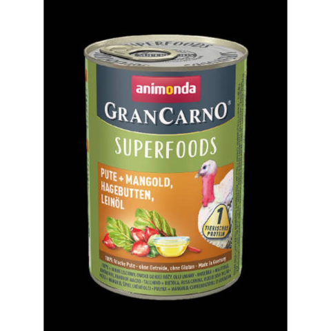 1 kép Animonda GranCarno Adult (superfood) konzerv - Felnőtt kutyák részére, pulyka, mángold, csipkebogyó, lenmagolaj (400g)