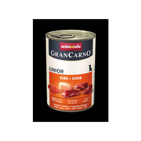 Animonda GranCarno Junior (marha+csirke)Teljesértékű eledel növésben lévő kutyusoknak.Kiszerelés: 400 gA kutya köztudottan a farkas leszármazottja. Tizenötezer emberek oldalán töltött év alatt a kutyák jelleme és kinézete rendkívüli változáson ment keresztül. Ezzel ellentétben a táplálkozási szokásaik és igényük a friss állati eredetű nyersanyagokra változatlan maradt. A GranCarno kutyaeledel kizárólag friss húsfélékből készül, mint a szív, tüdő, szí