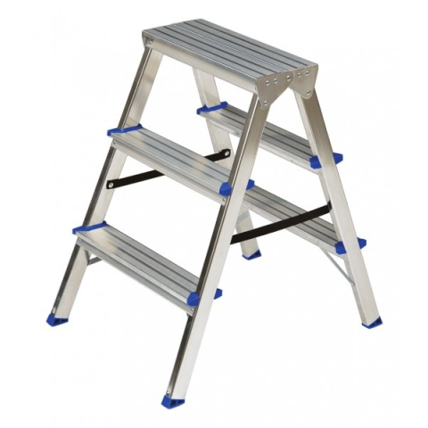 Két oldalt járható alu létra 2x3 a kétoldalas hozzáférésű lépcsős létrák számos munkához használhatók bel- és kültéren egyaránt csúszásgátló futófelületek háztartási használatra A létra könnyű, stabil és könnyen tárolható 2 biztonsági rögzítő pánt 80 mm