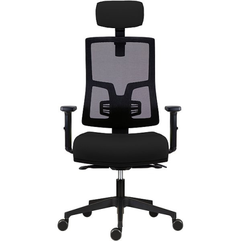 Irodaszék - forgó és ergonomikus szinkron mechanikával, terhelhetősége 150 kg, anatómiailag formázott ülőke állítható ülésmélységgel és magassággal, deréktámasz, állítható magasságú fejtámla, kartámasz állítható előre/hátra, függőlegesen, műanyag görgők 6 cm átmérővel, műanyag konstrukció, huzat anyaga textil és hálós anyag, lábak anyaga műanyag, mérete 66,5 × 62 cm (Sz×Mé), a vevőnek kell összeszerelni, tömege 16 kg Biztosíts kényelmes mu