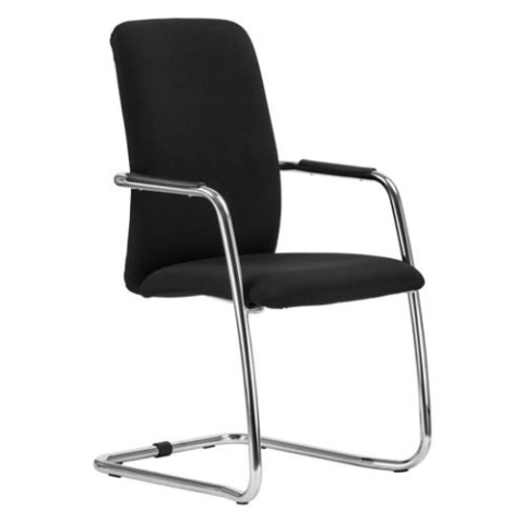 Szánkótalpas, krómozott acél vázú tárgyalószék magas háttámlával. Műanyag karfa, műanyag háttámla- és ülőlap burkolat. Kárpitozott háttámla és ülőlap. BN szövettel. Rakásolható: 3 db-ig. Teherbírás: 110 kg. .