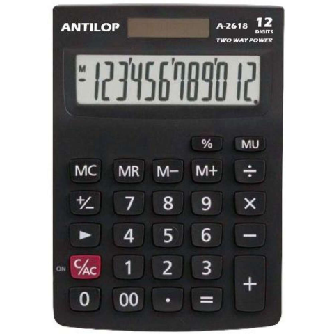 Antilop A2618 fekete asztali számológép 12 számjegyű nagy kijelző, memória funkció, százalékszámítás, haszonrés számítás, 00, előjel váltás, vissza léptetés és alapműveletek. Működési mód: napelem+elem. Méret: 140 x 100 x 28 mm. 100db/karton Katalóguskód: 1708 Hiteles tájékoztatás: Elkötelezettek vagyunk termékeink biztonságának garantálásáért, nyomon követjük a termékbiztonsággal kapcsolatos valamennyi európai uniós és hazai szabályozást é