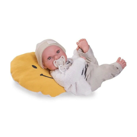 Antonio Juan Eric újszülött baba mosolygós párnával: Élethű baba puha vinil testtel és vidám kiegészítővel 😊 Ez az édes kisfiú, Eric, azonnal ellopja a szíved! 42 cm magas, kézzel festett szemekkel, hosszú szempillákkal és kipirosodott arccal rendel...
