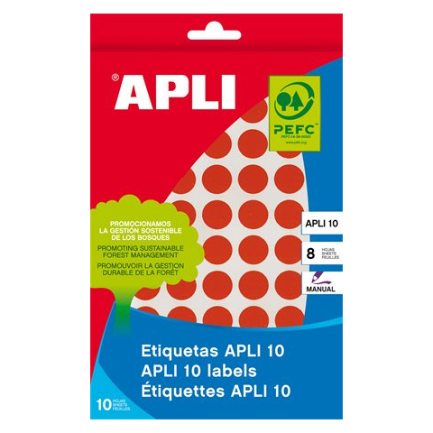 Etikett, 10 mm kör, kézzel írható, színes, APLI, piros, 1008 etikett/csomag - figyelemfelkeltő hatású, ideális árakciók, figyelmeztető feliratok készítésére, vagy színkódos jelölésre - megkapta a PEFC tanúsítványát, megfelel a nemzetközi fenntartható e