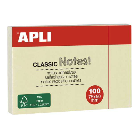 Öntapadó jegyzettömb, 50x75 mm, 100 lap, APLI Classic, sárga - ideális üzenethagyásra az irodában és otthon - kiváló tapadás - klasszikus sárga színben - megkapta az FSC (Felelős Erdőgazdálkodás Tanácsa) tanúsítványát, megfelel a környezettudatos gy