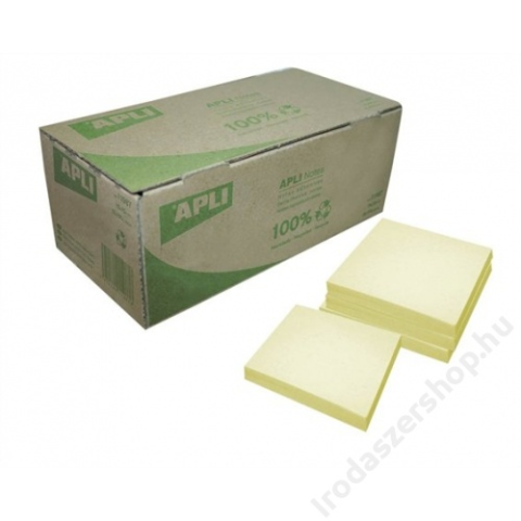 Öntapadó jegyzettömb, 75x75 mm, 100 lap, újrahasznosított, APLI, sárga (LNP11987) - 100%-ban újrahasznosított és újrahasznosítható anyagból készült - klasszikus sárga színben - a csomag 12 db tömböt tartalmaz - megkapta az FSC (Felelős Erdőgazdálkodás