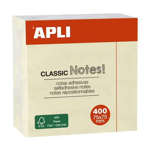 Öntapadó jegyzettömb, 75x75 mm, 400 lap, APLI Classic, sárga - ideális üzenethagyásra az irodában és otthon - kiváló tapadás - klasszikus sárga színben - megkapta az FSC (Felelős Erdőgazdálkodás Tanácsa) tanúsítványát, megfelel a környezettudatos gy