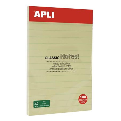 APLI Öntapadó jegyzettömb, vonalas, 100x150 mm, 100 lap, APLI "Classic", sárga