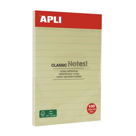 Öntapadó jegyzettömb, vonalas, 100x150 mm, 100 lap, APLI Classic, sárga - ideális üzenethagyásra az irodában és otthon - kiváló tapadás - klasszikus sárga színben - megkapta az FSC (Felelős Erdőgazdálkodás Tanácsa) tanúsítványát, megfelel a környeze