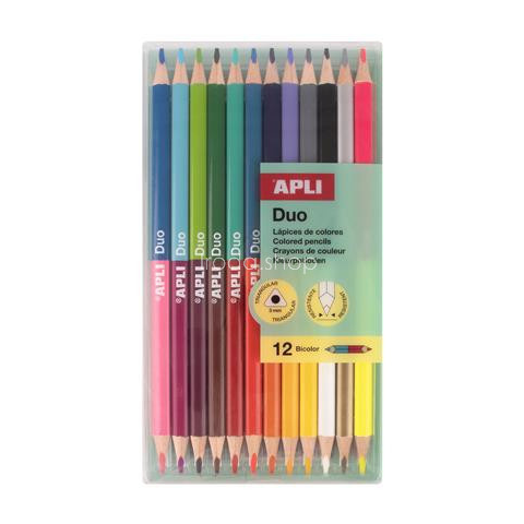 Színes ceruza készlet, kétvégű, háromszögletű, APLI Duo, 24 különböző szín Dupla színvilág, dupla kreativitás. Fedezd fel a kétvégű színes ceruzát, mely 12 darab ceruzával 24 csodálatos színt nyújt. -puha, mégis tartós hegy -kényelmes, háromszöglet