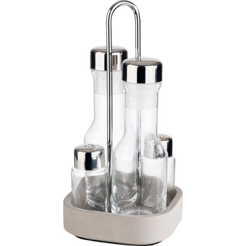 Az 5 részes sótartó a következőket tartalmazza: betonállvány rozsdamentes markolattal, üvegből készült só- és fűszertartó, ecetes és olajos palack és rozsdamentes csavarós tető. Az állvány alja csúszásmentes, amely védi a bútort a karcolásoktól. A betonállvány nem mosható mosogatógépben.