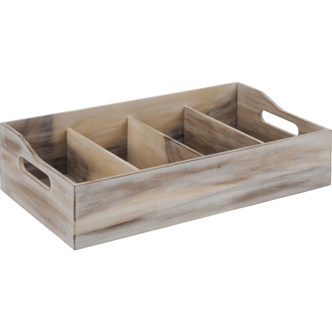 Fehér vintage APS evőeszköztartó akácfából, 4 rekesszel (26 x 11,5 cm), fedél nélkül. Méretek: Magasság 130 mm, hosszúság 510 mm és szélesség 280 mm. Ideális az evőeszközök és konyhai eszközök rendszerezéséhez.