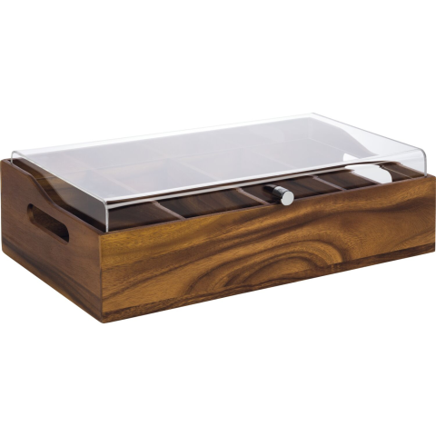 APS evőeszköztartó természetes akácfából, 4 rekesszel (260 x 115 mm) és fedéllel. Ideális evőeszközök és konyhai eszközök rendszerezéséhez. Magasság: 145 mm, Hosszúság: 510 mm, Szélesség: 280 mm. Kiváló minőségű akácfából készült.