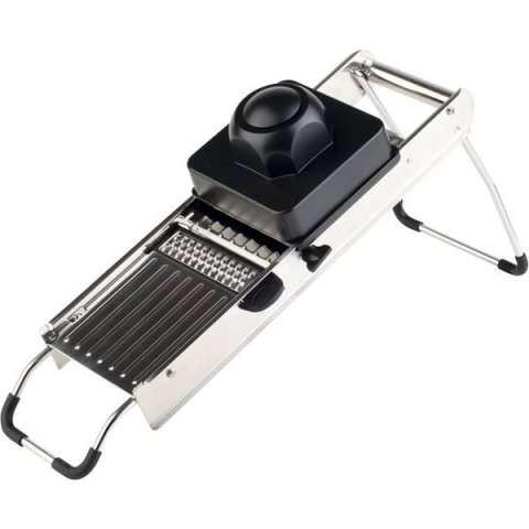 Az APS kézi zöldségszeletelő mandolina 7 különböző pengével és fekete csúszásmentes kerettel. A penge szélessége 100 mm, védőburkolat. Rozsdamentes acélból készült. Ideális saláták és zöldséges ételek elkészítéséhez.