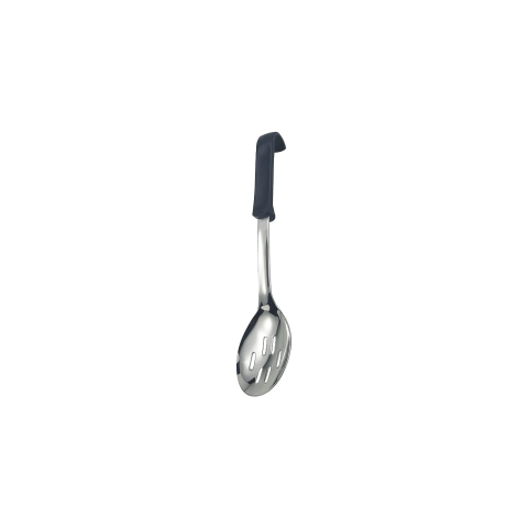 Az APS perforált tálalókanálja fekete csúszásgátló fogantyúval rozsdamentes acélból készült. A kanál 120°C-ig hőálló, méretei 340 mm (hosszúság) x 70 mm (szélesség). Ideális mártással készült ételek tálalásához vagy a folyadék szilárd összetevőktől történő elválasztásához. Az APS gyártotta, amely ismert a minőségi konyhai eszközök gyártásáról.
