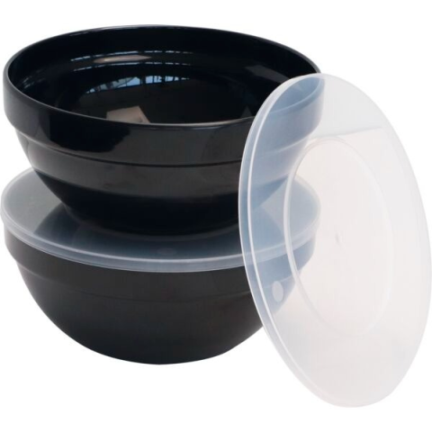 APS Casual melamin tálkák készlete fedővel. A készlet 2 fekete tálkát és 2 fedőt tartalmaz. A melamin tálkák a pala megjelenését utánozzák, tartósak és minimális karbantartást igényelnek. A tálkák mosogatógépben moshatók és BPA-mentesek. Űrtartalom: 1,8 liter.