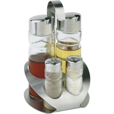 Az APS Pro négyrészes rozsdamentes fűszerkészlet ideális az ételek ízesítéséhez. A szett üveg tartókat tartalmaz sóhoz, borshoz, olajhoz és ecethez. Kiváló minőségű rozsdamentes acélból és üvegből készült. Magasság: 190 mm. Az APS cég vezető gyártója a minőségi konyhai eszközöknek.
