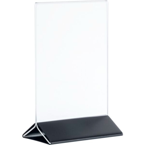 Fekete APS menükártyatartó, A4-es méretben. Rozsdamentes acélból készült talpból és akril tartóból áll. Nem alkalmas mosogatógépbe. A menütartó éttermek és kávézók számára készült.