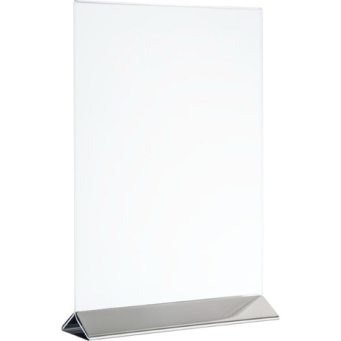 Az APS A6 méretű menükártya-tartó állvány rozsdamentes alappal és akril tartóval rendelkezik. Az ezüst színű állvány nem alkalmas mosogatógépben való használatra. Magasság: 170 mm.