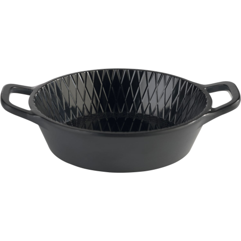Az APS fekete mini tálka fogantyúval melaminból készült. Méretei 85 x 115 mm, magassága 25 mm. A tálka szürke, fekete és fehér mintázatú. Ideális kis adagok tálalására vagy mártogatós tálként.