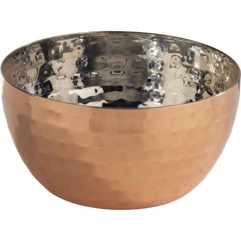 APS Mumbai tál rozsdamentes acélból, rézhatású külső felülettel és kovácsolt struktúrával. Arany fogantyúk. Átmérő: 90 mm, magasság: 50 mm, űrtartalom: 0,2 l. Minden konyhába alkalmas.