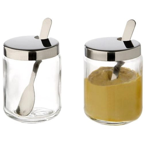Asztali fűszertartó - 2 darabos készlet fűszerekhez és parmezánhoz, anyaga üveg és fém, magassága 63 mm, mosogatógépben mosható Egyszerű kialakításának köszönhetően az ízléses fűszertartó bármilyen belső térbe illeszkedik. Az APS mustáros készlet két átlátszó üvegedényt tartalmaz, melyek rozsdamentes acélból készült 5 × 6 cm-e